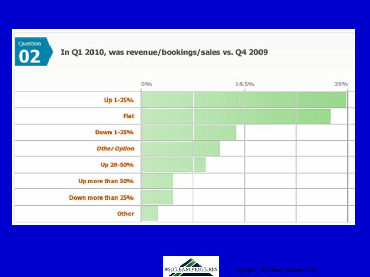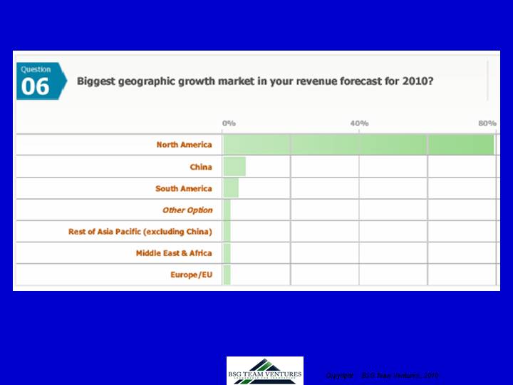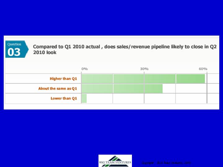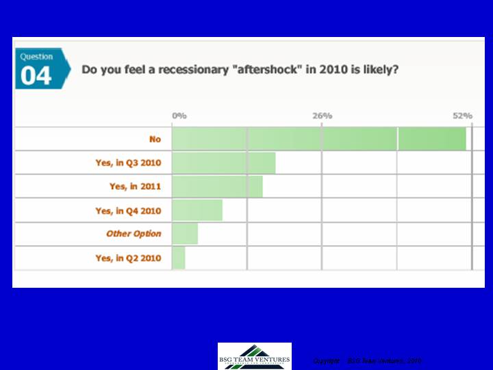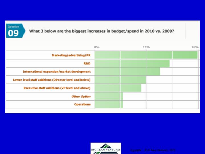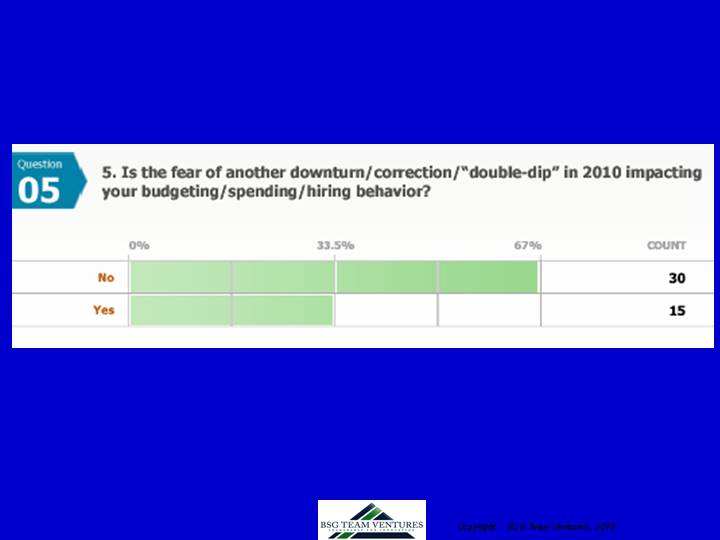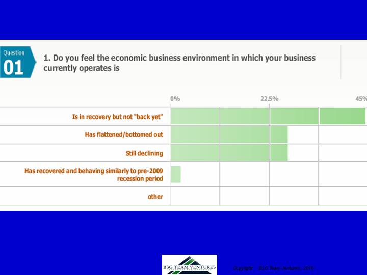 We at BSG Team Ventures periodically take the temperature of the markets we serve. Below are the results. This survey's focus was on the economic recovery (is it indeed here, and if so, measured how?), and where CEOs are budgeting their spend in the 2010 recovery year.